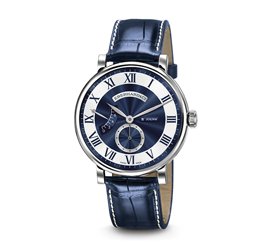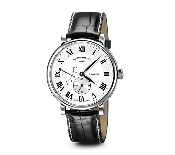 Nella collezione 8 Jours, tecnica, passione e tradizione si fondono, dando vita ad orologi meccanici manuali che si caricano una sola volta ogni 8 giorni. Sul quadrante si trova un indicatore dal dispositivo di funzionamento brevettato, la cui lancetta visualizza l’autonomia di marcia e ricorda per quanto ancora l’orologio segnerà il tempo. L’innovazione di Eberhard & Co. consiste in uno speciale dispositivo di carica brevettato formato da due molle sovrapposte che complessivamente superano il metro e mezzo di lunghezza.