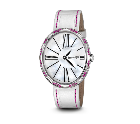 Eberhard & Co. con Gilda ridisegna la sua idea di femminilità. Le linee morbide della cassa ellittica, l’armonia degli esclusivi dettagli e il motivo floreale inciso sul fondello raccontano un’eleganza moderna e insieme eterna. L’estrema raffinatezza di Gilda è arricchita in tutti i modelli da materiali preziosi, come la madreperla e i diamanti, zaffiri e rubini. Un insieme sensuale e volitivo, costellato di piccoli segreti, come una donna.