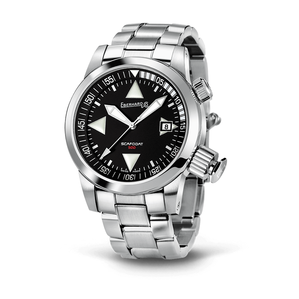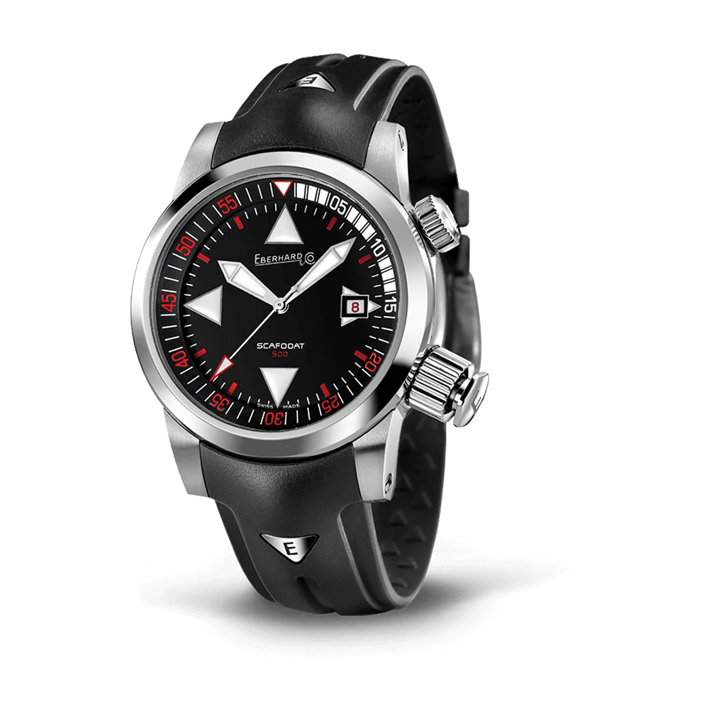 The crown at 4 o’clock with a special security device activating the inner rotating flange, useful for indicating diving times on a sexagesimal basis.