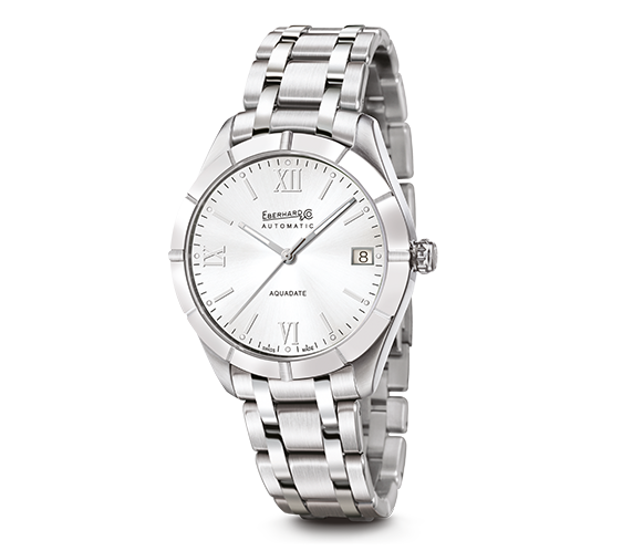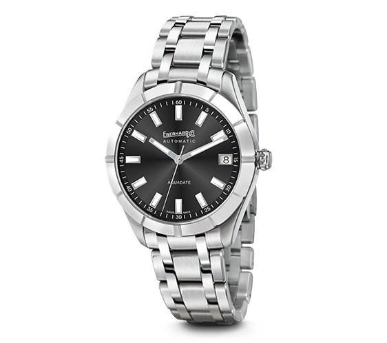 Fixed bezel in polished steel, 4 satin-finished knurls, 8 satin-finished markers in relief.