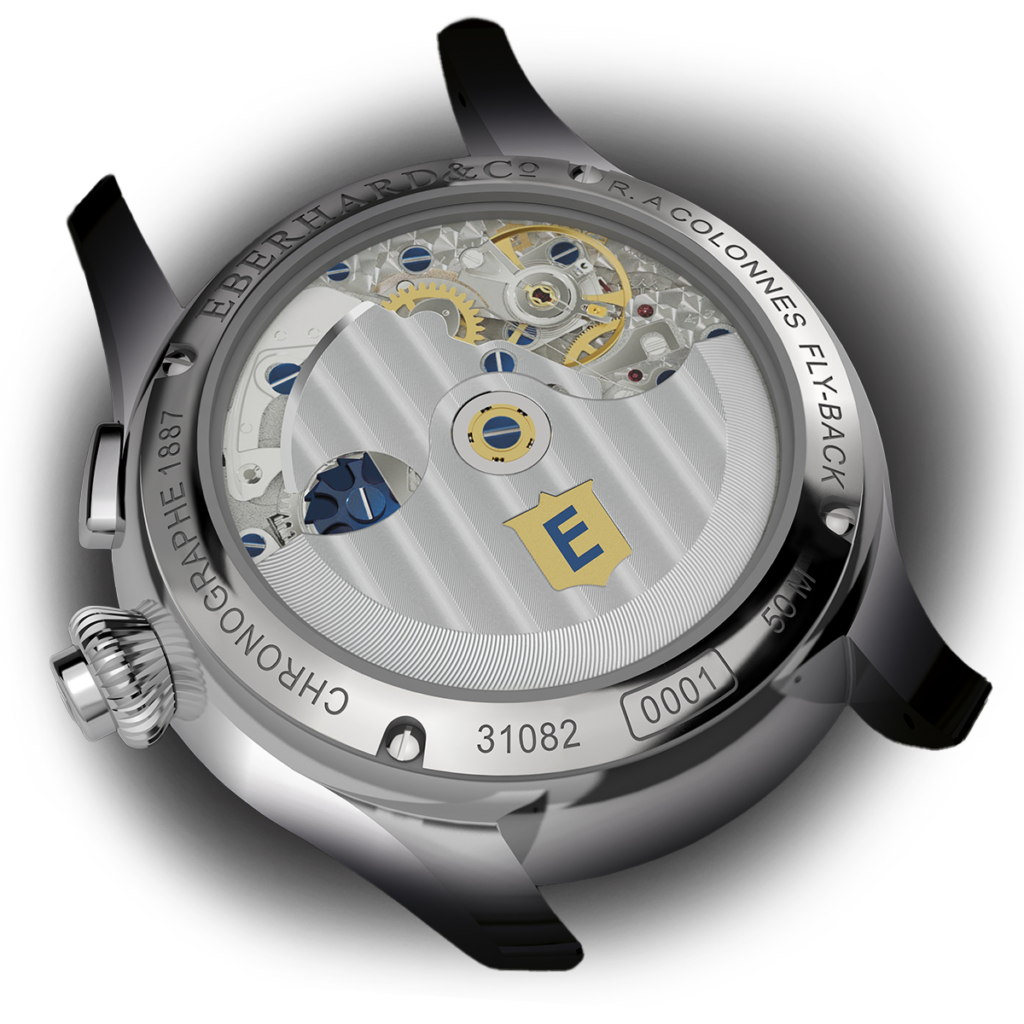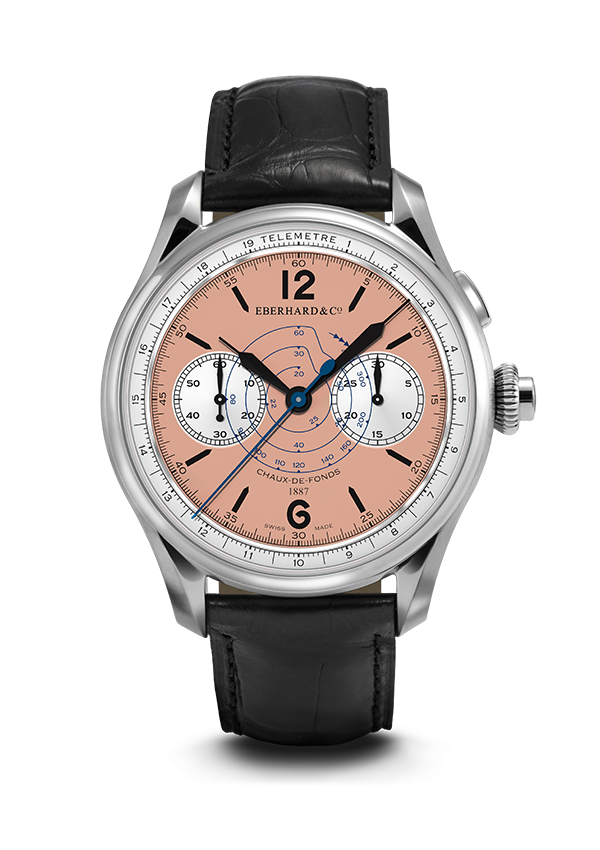 Dettagli come la corona in stile vintage con pulsante coassiale o le linee sinuose della cassa evocano i cronografi d’epoca Eberhard & Co.