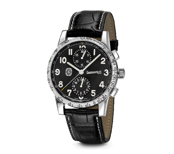 Black dial with white or black counters with special “frappé helicoidal” finishing. Luminescent Arabic numerals. At 9 o’clock, Tazio Nuvolari’s lucky charm in the shape of a stylised tortoise